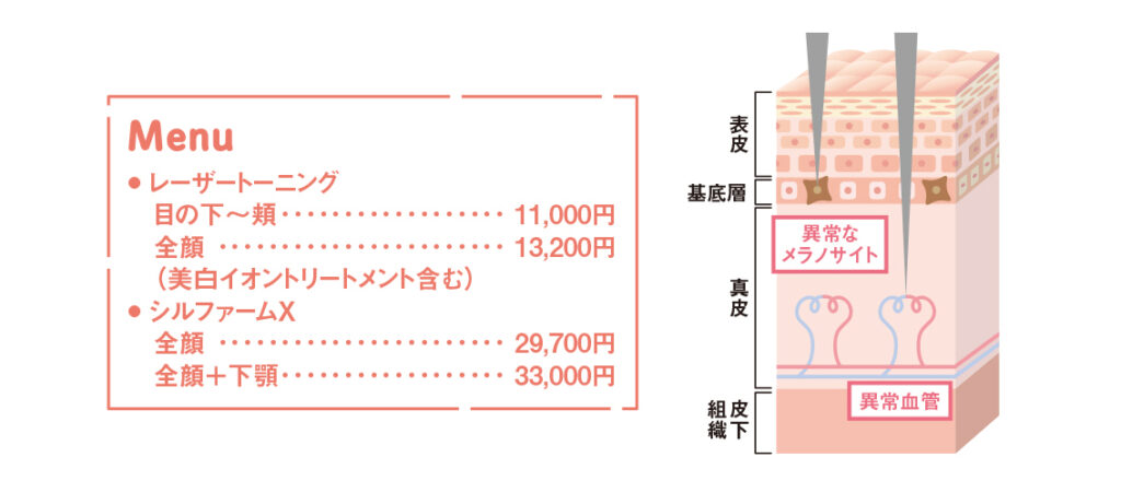 また、最近はシルファームXも肝斑の有効な治療としておすすめしています。月1回、表皮基底層の異常なメラノサイトと異常な血管を的確に狙い改善をはかります。その結果、過剰なメラニンを作りすぎない正常なメラノサイトに生まれ変わり肝斑がよくなります。