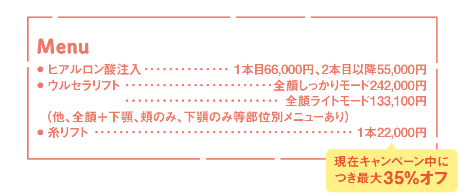 下垂によるたるみには、ウルセラリフト(高密度焦点式超音波:HIFU)、糸リフトを行っています。ウルセラリフトは、超音波で焼くことで浅筋膜をギュッと引き締める施術ですが、それだけではなく、同時に重い脂肪を減らす効果もあります。当院では従来のしっかりモードに加えて、ライトモードの2コースを用意しました。詳しくはお問い合わせくださいね。